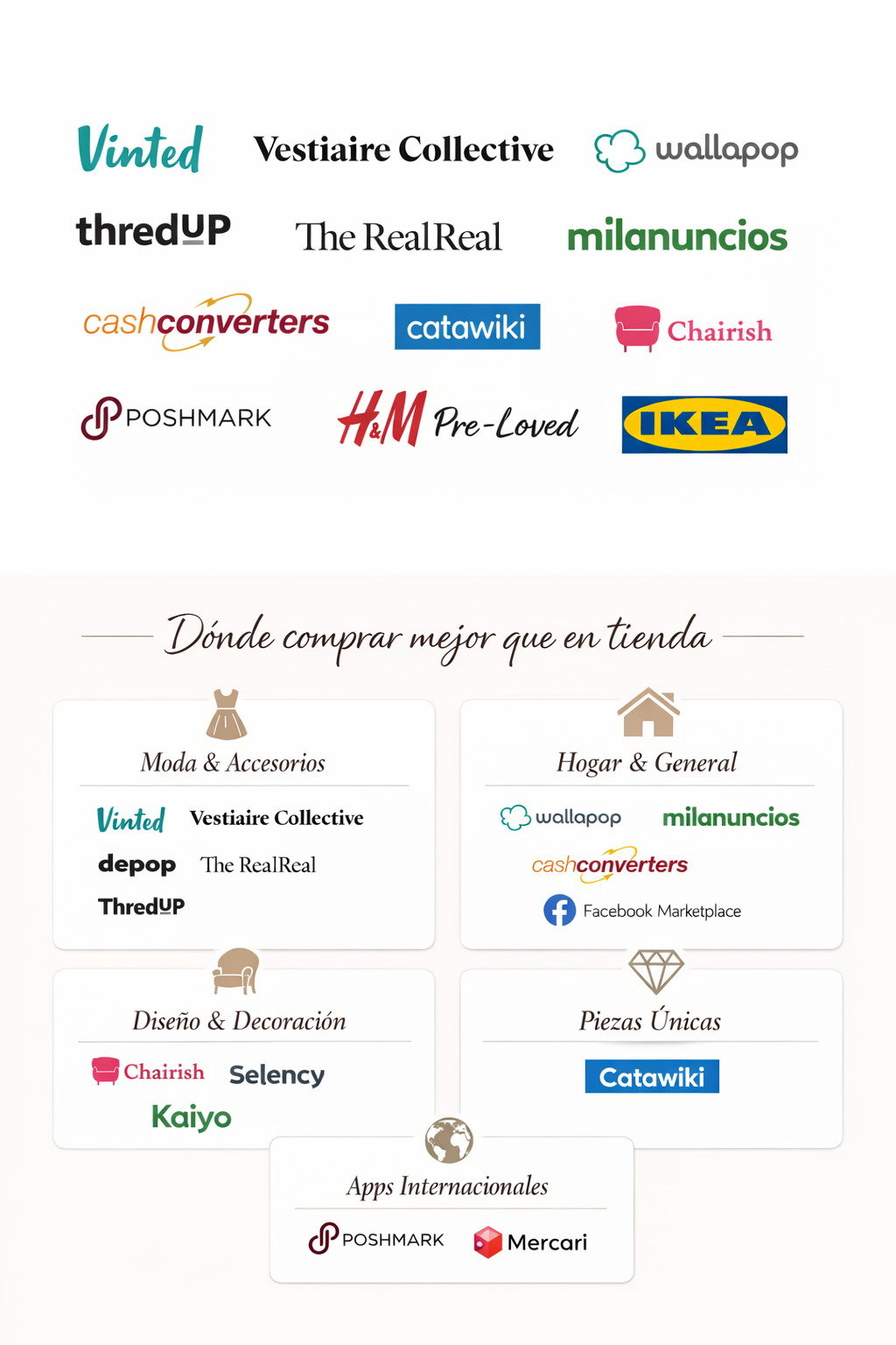 - Moda y accesorios: Vinted, Vestiaire Collective, Depop, eBay, ThredUp, The RealReal, Rebelle